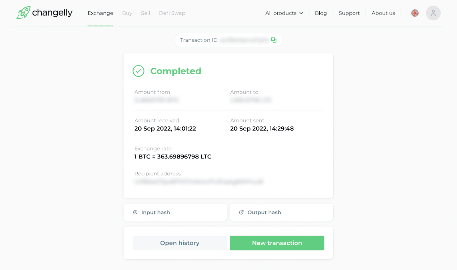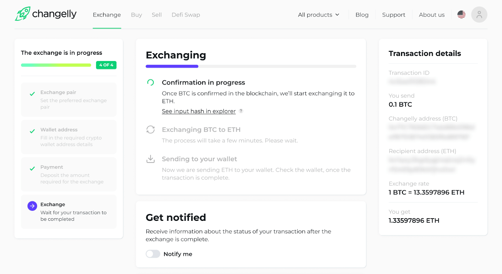 Before you send your funds for an exchange, please make sure that all the transaction details are correct. We kindly remind you that blockchain transactions are irreversible. Therefore, when dealing with cryptocurrencies, you have to be careful and attentive to all of the transaction details.