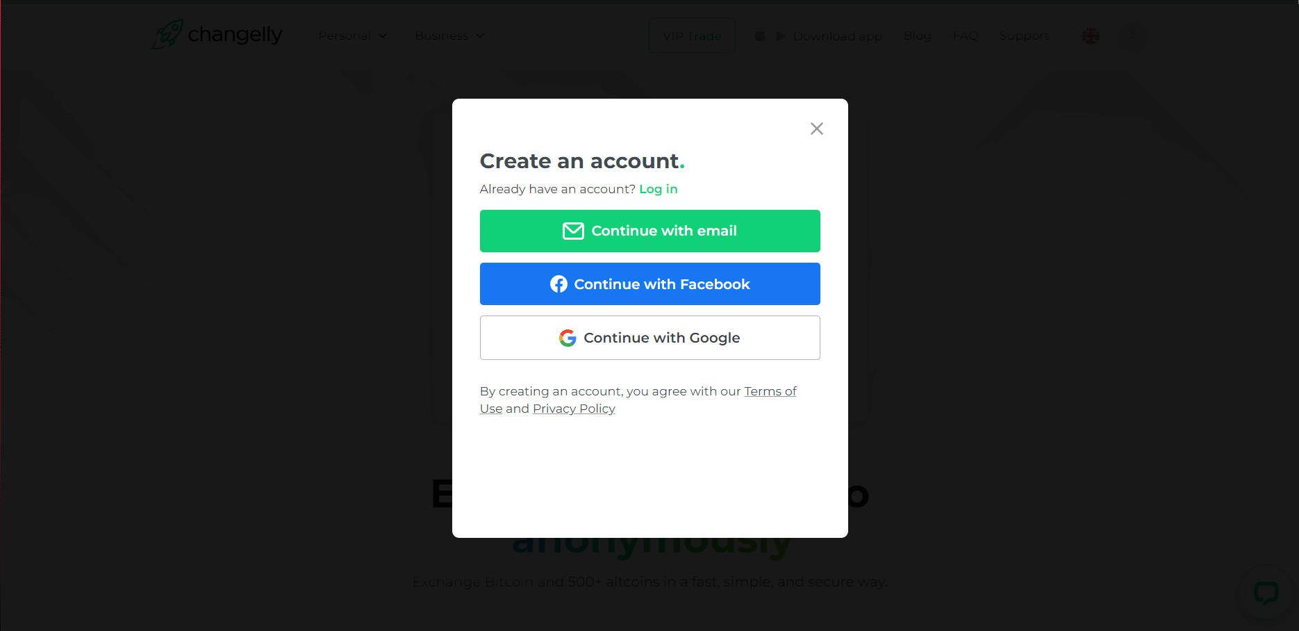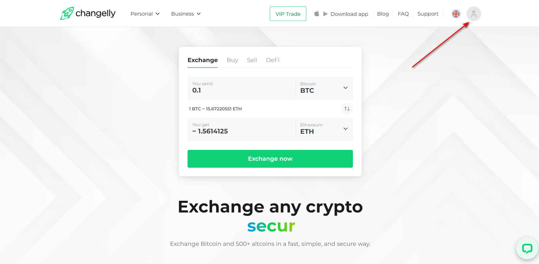 To create an account, go to changelly.com, click on the silhouette icon in the top right corner, and then click on “Create an account.”