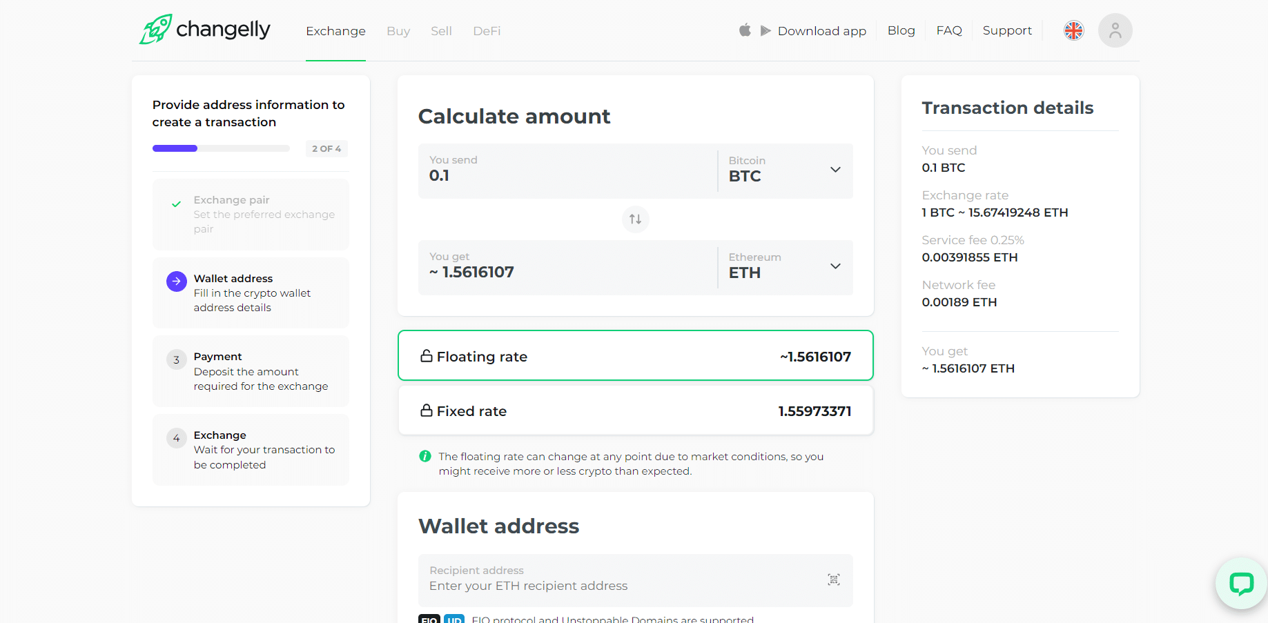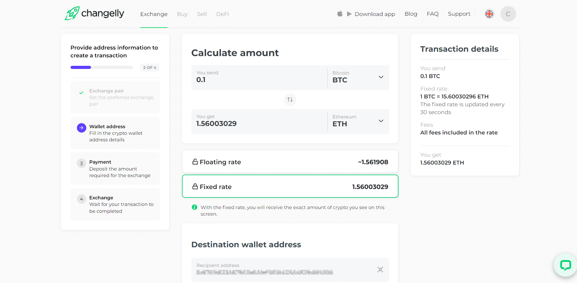 When exchanging crypto at fixed rates, the final amount of exchanged cryptocurrency will remain the same as the estimated one regardless of the market’s movements. This means even if the market turns red, the final amount of exchanged cryptocurrency won’t change.