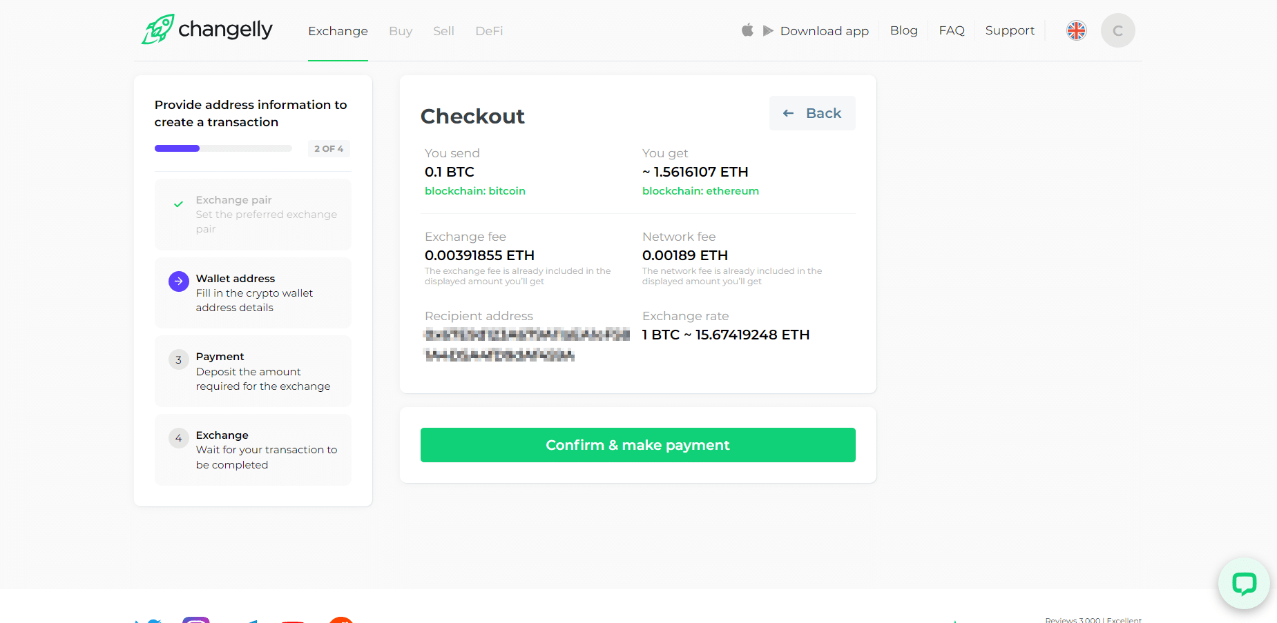 Click the “Confirm and make payment” button. Send the exact amount from your wallet or the exchange account to the following address. Please note that you have around 15 minutes to complete the payment (when exchanging crypto at a fixed rate).
