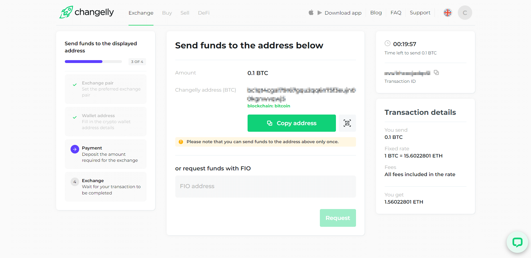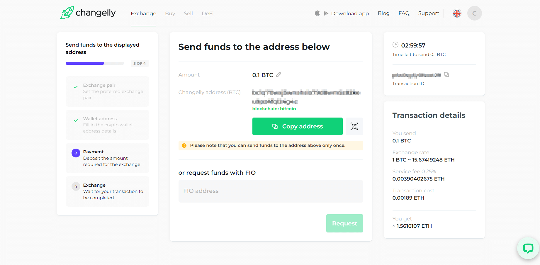 It is time to send the required amount from your wallet or exchange account to the following address. When exchanging crypto at a floating rate, you have around 3 hours to complete the transaction, otherwise, it will be canceled automatically.