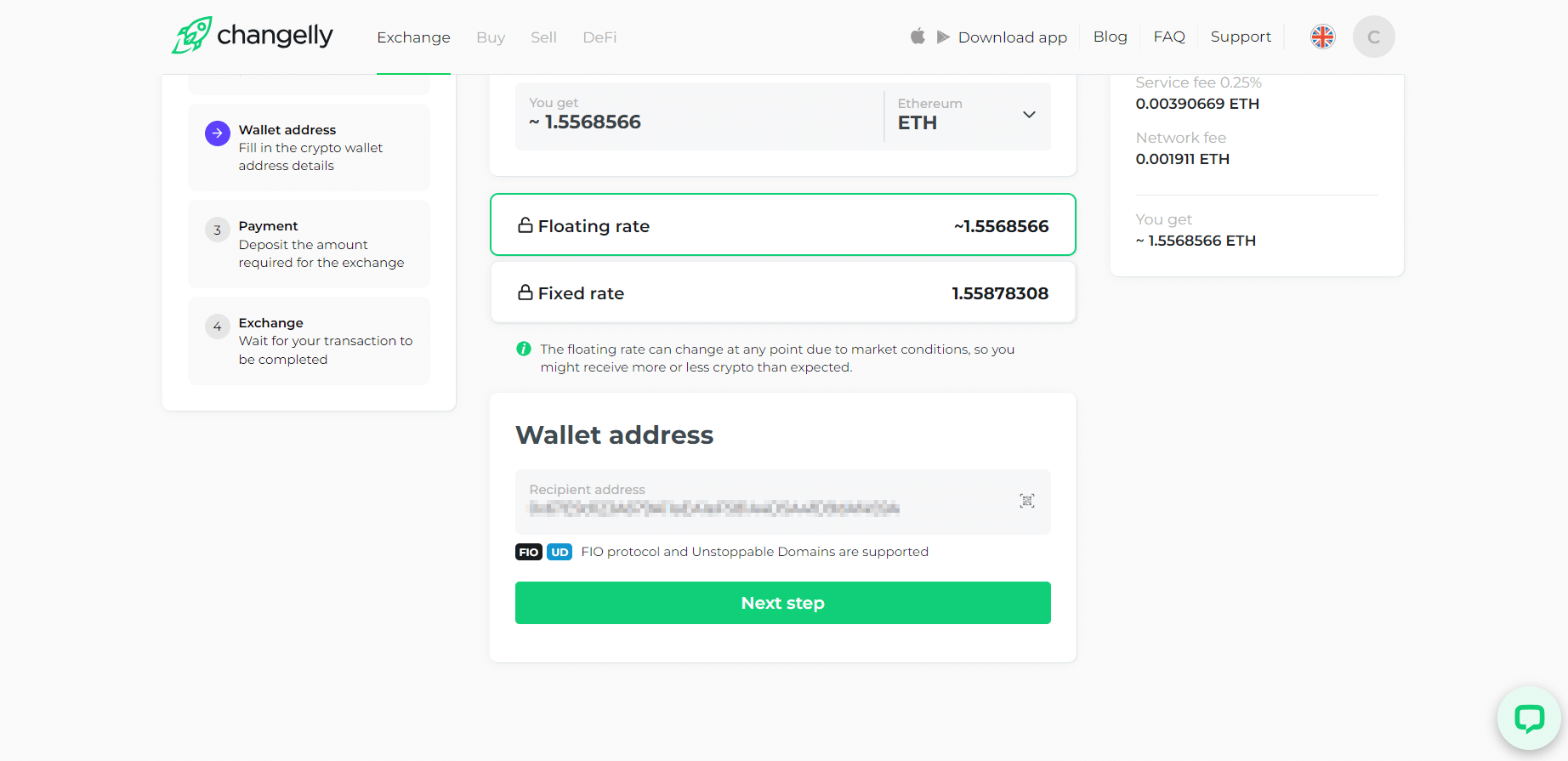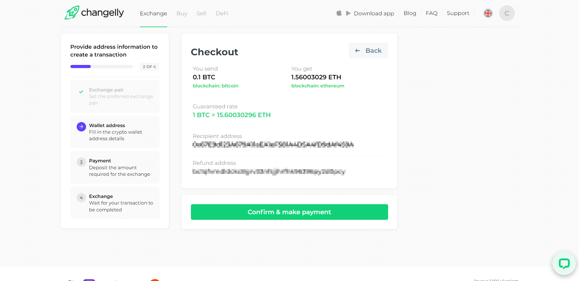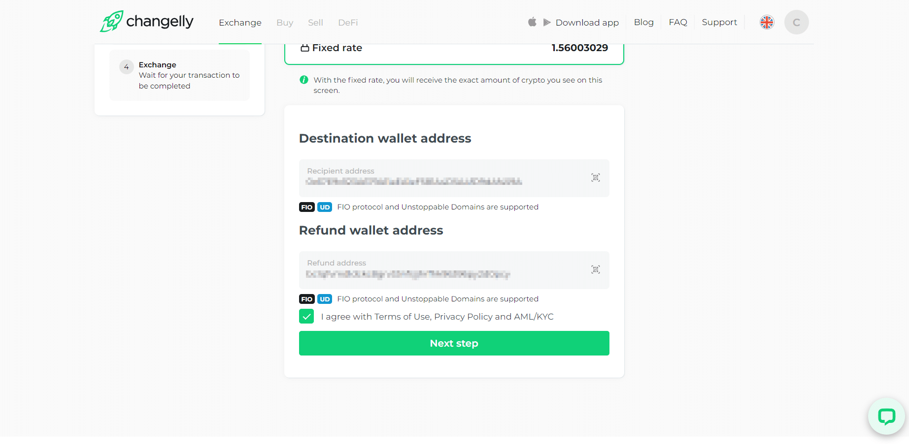 Since we have chosen an exchange at a fixed rate, we need to provide two crypto addresses: one that your new crypto will arrive to, and one that supports the cryptocurrency you’re paying with. The latter is required for a refund process. If there are any technical issues during the crypto exchange, we will return your funds to the provided refund address. Once done, click the “Next step” button.